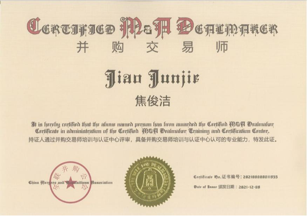 北京五辰律师事务所焦俊洁律师参加第188期PEMA培训课程,在系统学习了股权投资基金的募投管退、并购战略与操作、并购与基金的法律安排、投资交易中的财税风险及估值等课程后,获得《并购交易师》证书,并成为全联并购公会会员,享受相应权益,进入专业技术人才信息库。